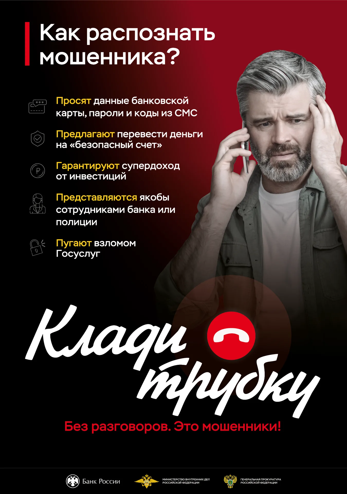 Важно: если хотя бы один из признаков совпал, не стоит вести разговор дальше. Не стоит переводить деньги незнакомцам и сообщать коды доступа. Если есть сомнения, нужно позвонить родственникам, знакомым или адвокату — иногда достаточно просто обсудить ситуацию с кем-то, чтобы проверить факты.