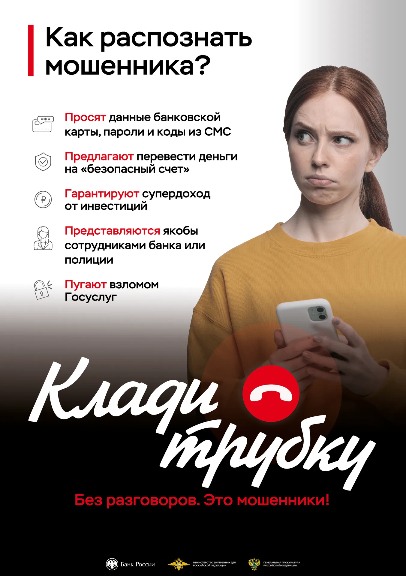 - Просьба назвать конфиденциальные данные. Ни банки, ни государственные органы никогда не запрашивают в телефонном режиме пароли, PIN-коды, CVV/CVC карты, полные реквизиты карт или коды из SMS.